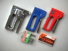 3枚目は買ったタッカー三種類。左側は幅10mmのもので、パワーは一番あるのですが針の厚みがありすぎて刺さりにくので使っていません。980円くらいでした。真ん中のは安いタッカー。下側も外れません。針が詰まったらどうするのだろう。右側のものが使ったタッカー。コーナンで480円程度でした。パワーは無いのですが、さした後、ラジオペンチで押し込んで作業をしました。