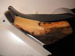 4枚目は装着後の写真。外す際の手間を教訓にして、付ける際はそれほど時間はかかりませんでした。でも2時間程度。少し傾いて付けてしまったので一度外して棒ヤスリで穴を広げて再度装着しました。メインのシート部分は削り中のスポンジです。タンデム部分を削ってフラットにしようと努力中。うまくいくのでしょうか。