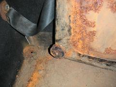 サイドカー側の下のシートを外してみました。写真は外した結果。シートはサイドカーの骨格に長いボルトを通して固定してありました。下側にもぐりこんで4つのボルトを外します。一つ目は何とか外れました。ボルトが錆びている…。で、2つ目を外しているとバキッ!